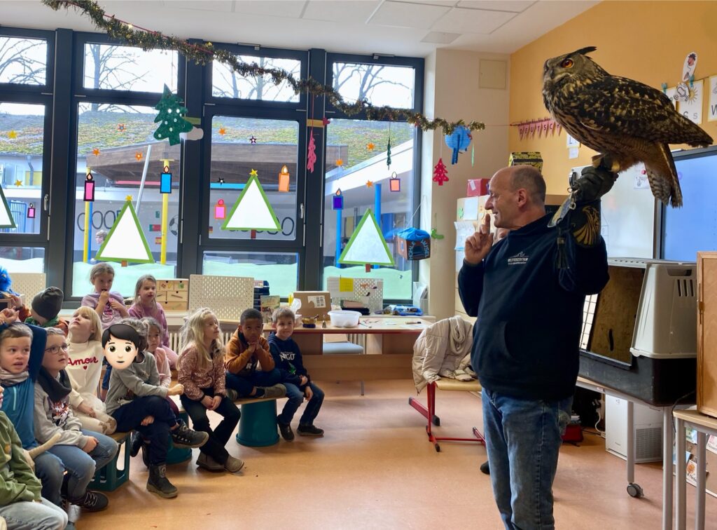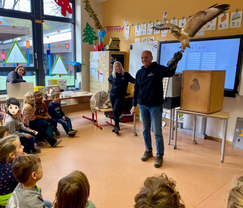 Die Kinder der ersten Klassen empfingen am Donnerstag wilden Besuch: Herr Meyer vom Wildtierzentrum Saarburg kam in die Schule und brachte verschiedene Wildtiere (Hahn, Mäuse-Bussard und Uhu) mit.