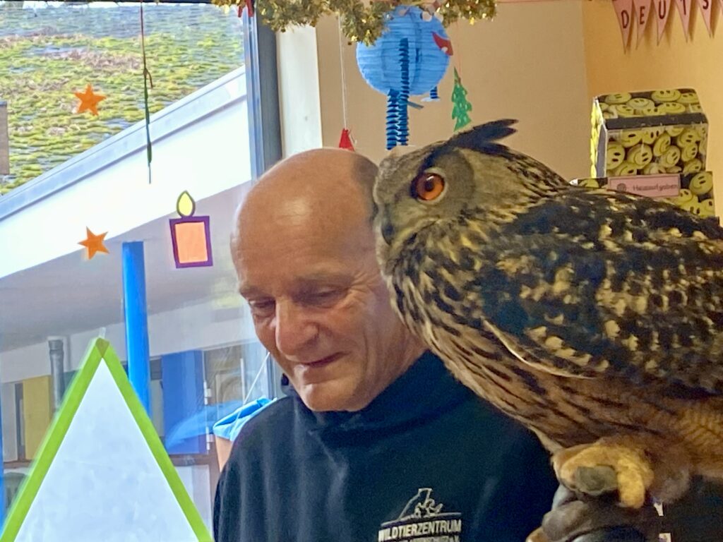 Er informierte die Kinder über die Tiere, die Aufgaben des Wildtierzentrums und seine Arbeit. Natürlich durften viele Fragen gestellt und über eigene (Wild)Tier-Erlebnisse berichtet werden. Das Highlight war, die flauschig-weichen Federn des Uhus vorsichtig zu streicheln.