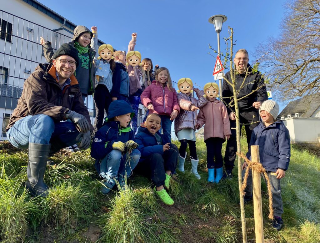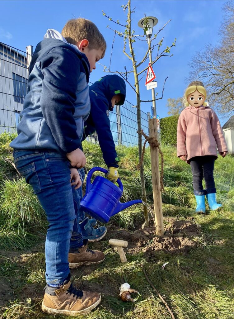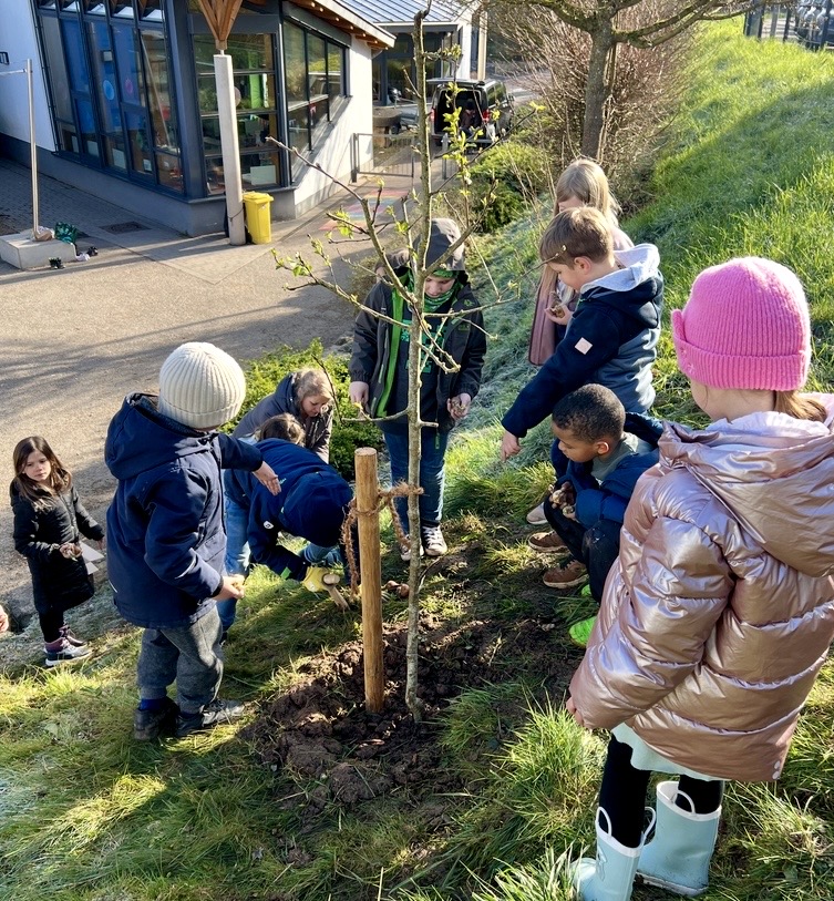 Die Kinder der Erdmännchenklasse hatten einen besonderen Wunsch: Ein eigener Apfelbaum sollte den Schulhof verschönern â und zwar genau dort, wo sie ihn zu jeder Jahreszeit direkt von ihrem Klassenzimmer aus beobachten können.