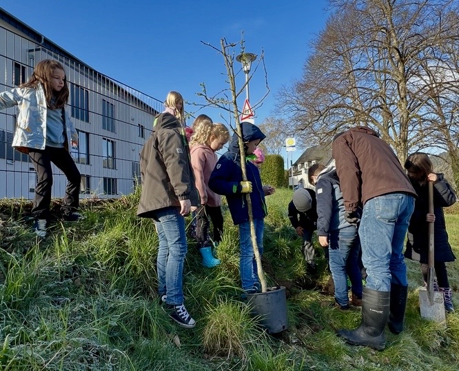 Heute, am letzten Schultag vor den Ferien, war es endlich so weit: Gemeinsam wurde der Baum eingepflanzt und die Narzissen gesetzt.
